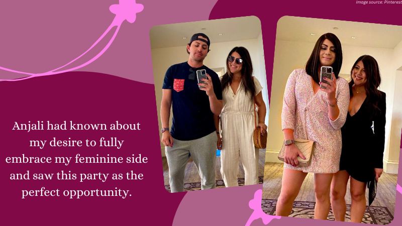One day she invited me to a bachelorette party of her step sister. I told her, “What will I do among other girls because I didn’t know anyone in her family?” But she insisted and told me that it was only a girls’ party, and I had to also crossdress completely. Anjali had known about my desire to fully embrace my feminine side and saw this party as the perfect opportunity.