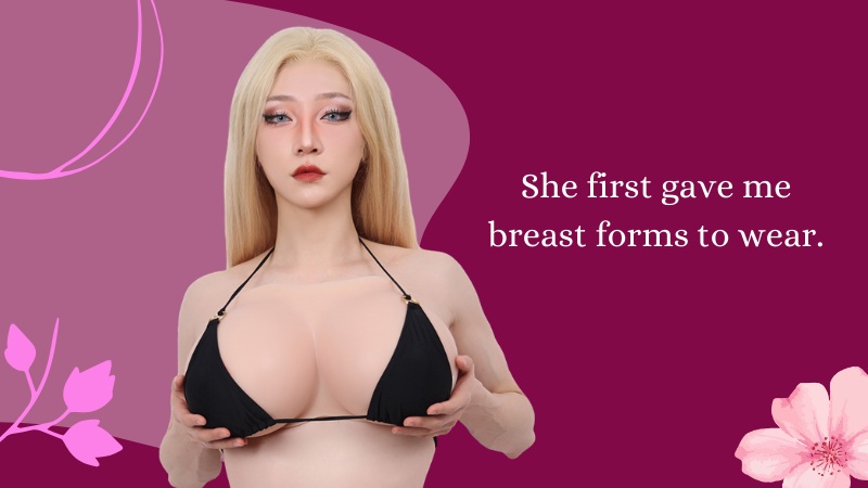 She first gave me breast forms to wear. I was surprised that she had prepared all this for me. After wearing breast forms, I felt so good, the feeling of having boobs was truly amazing. Then, she started doing my crossdressing makeup. Starting with mascara, then blusher on cheeks, then bright red lipstick, and finally, a wig.