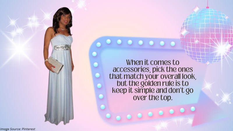When it comes to accessories, pick the ones that match your overall look, but the golden rule is to keep it simple and don’t go over the top. Don’t forget to pick out a handbag or clutch that matches your dress!