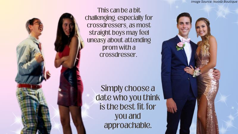 This can be a bit challenging, especially for crossdressers, as most straight boys may feel uneasy about attending prom with a crossdresser, and it might be hard to find gay boys in your class.