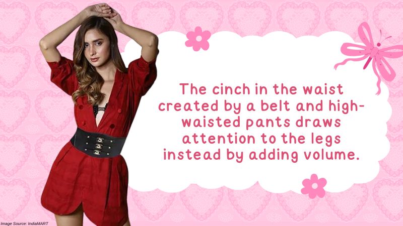 The cinch in the waist created by a belt and high-waisted pants draws attention to the legs instead by adding volume. Peplum tops add volume to the hips and leg lines, giving us an entire torso.
