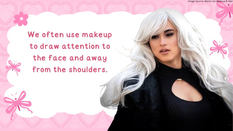 Bold lips and eye makeup, as distraction techniques, work well in feminizing our shoulders. Red lipstick, for instance, does the trick, as do bold eyeshadow designs.