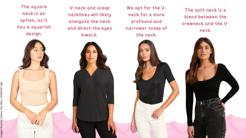 The square neck is an option, as it has a squarish design. We prefer square-neck tops and dresses, for instance, because they resemble a longer neck, which is likely to balance our broad shoulders well.
