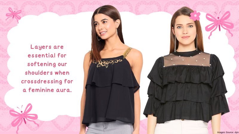 Layers are essential for softening our shoulders when crossdressing for a feminine aura. Layering involves using extra layers of clothing to add volume.