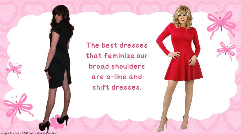 The best dresses that feminize our broad shoulders are a-line and shift dresses.