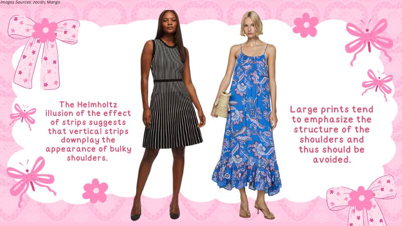 Large prints tend to emphasize the structure of the shoulders and thus should be avoided. For instance, a cheater-printed dress will make us more feminine in the shoulders compared to larger prints of