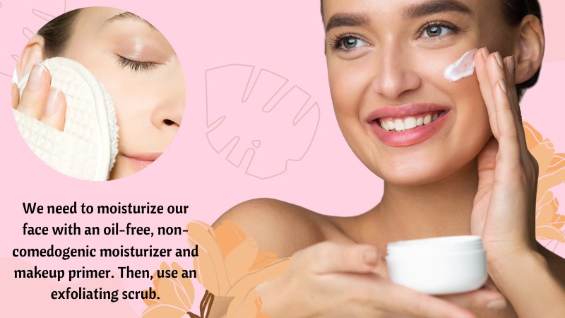 We need to moisturize our face with an oil-free, non-comedogenic moisturizer and makeup primer. This will make our skin smooth, and we can apply our foundation easily without any lines or streaks. Then, use an exfoliating scrub to remove dead skin cells and give us a fresh start. We can use one made for our face or body, just ensuring it’s gentle enough for sensitive skin types.