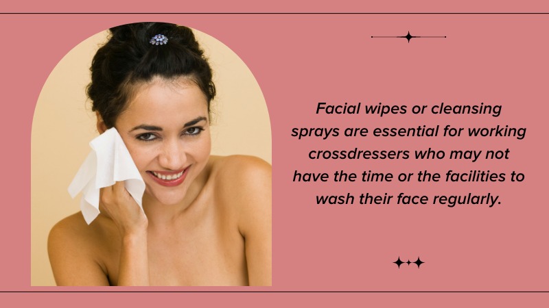 Facial wipes or cleansing sprays are essential for working crossdressers who may not have the time or the facilities to wash their face regularly. One way to ensure that you can keep your skin clean and refreshed throughout the day is to carry facial wipes or facial cleansing sprays with you. These products can help to remove excess oil, dirt, and sweat, leaving the skin feeling refreshed and clean. When selecting facial wipes or cleansing sprays, choose products that are gentle and designed for your skin type.