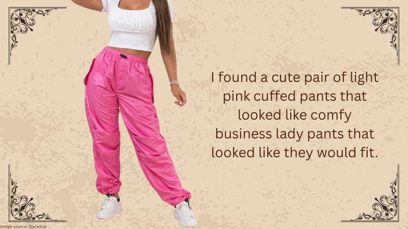 This Goodwill was a similar size, but I wasn’t sure if I would find anything that I was looking for there. This store was where I found my “Church Dresses,” as my wife calls them, so I figured that I would just find the same type of styles here. But thankfully, I was wrong! I found a cute pair of light pink cuffed pants that looked like comfy business lady pants that looked like they would fit. I also found a comfy knitted sweater that I liked that was in my size as well! Both of these items fit me well when I tried them on at home, so I am happy!
