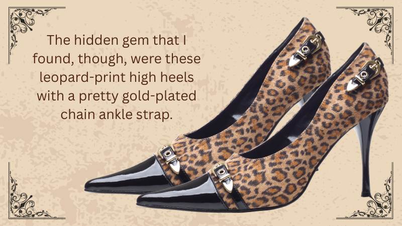 The hidden gem that I found, though, were these leopard-print high heels with a pretty gold-plated chain ankle strap. I could tell they were at least close to my size, but when I picked them up, it said they were size 42, and as an American, I had no clue what my size was in European Units. So I quickly Googled and found out they were definitely my size, and then I ran to check it out!