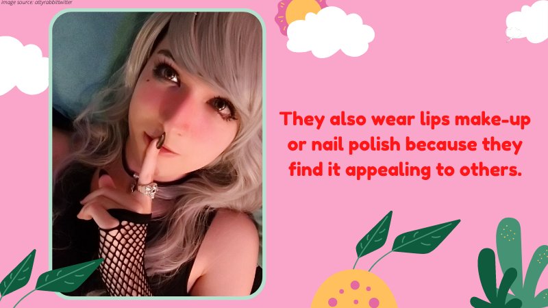 Sissy femboys also dress up in female clothing because they feel comfortable doing so, and they find themselves attractive while doing so. They also wear lips make-up or nail polish because they find it appealing to others; this helps them accept their feminine appearance. The sissies admire women who are confident with their appearance, making them want to embrace their feminine side too.