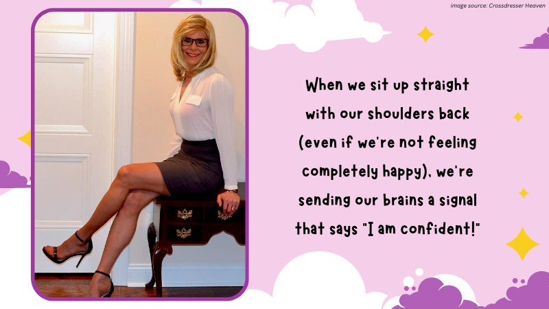 Good posture is essential for MtF crossdressers. It helps communicate to others that you are confident and true to yourself. When you slouch or slump, people will take notice of your body language and interpret it as a lack of confidence, which can lead to self-doubt, anxiety, and depression—not exactly the emotions we want to come across to people! People take notice when you stand up straight and tall. When you walk with confidence, people notice you. When you sit up straight, people can see your face and see that you are happy.