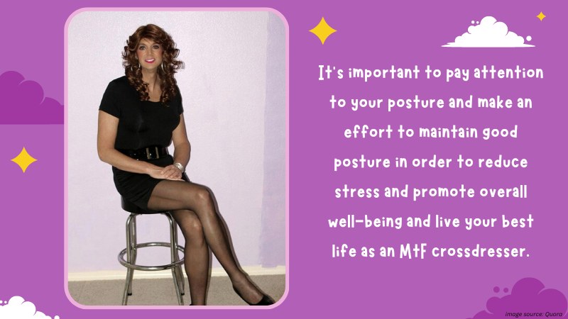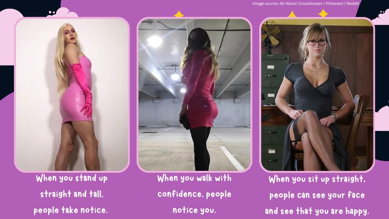 This can create a sense of tension and discomfort in the body, which can contribute to feelings of stress and anxiety. It can also impact your confidence and self-perception. Which can make you feel less confident and self-assured. Poor posture can also make it difficult to present yourself in a flattering and feminine way. Slouching or standing with poor posture can make you look less confident and attractive, impacting your overall confidence as an MtF crossdresser. It’s important to pay attention to your posture and make an effort to maintain good posture to reduce stress and promote overall well-being and live your best life as an MtF crossdresser.