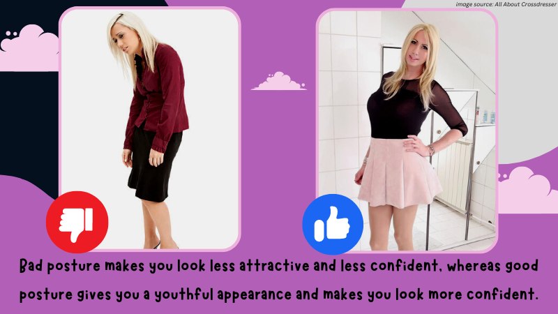 Take a look at yourself in pictures with good posture and without, which one do you like better? We’ve all heard that “you’re only as old as you feel,” but it turns out that there’s some truth behind that saying after all. You may not think about it, but your posture affects your appearance in a big way: it can make you look older and less confident, two things we all want to avoid as an MtF crossdressers.