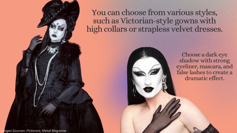 First and foremost, the dress is key. You can choose from various styles, such as Victorian-style gowns with high collars or strapless velvet dresses.