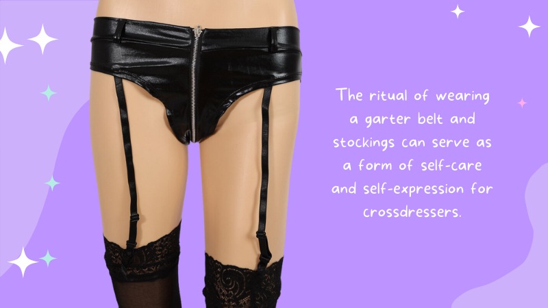 Additionally, the ritual of wearing a garter belt and stockings can serve as a form of self-care and self-expression for crossdressers.