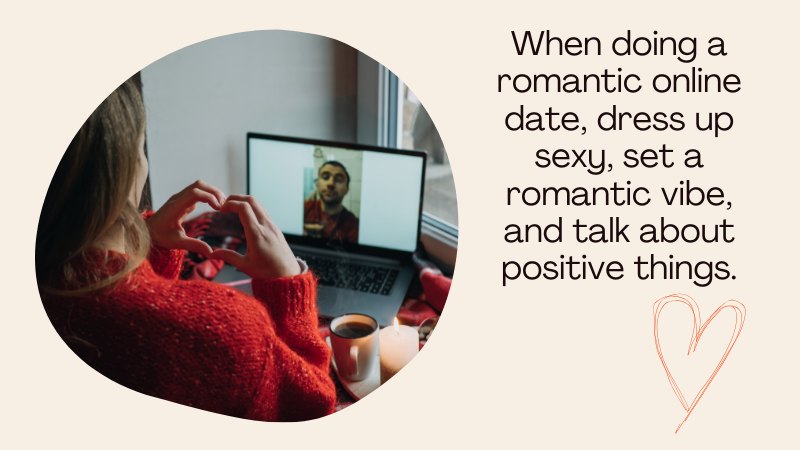 When doing a romantic online date, dress up sexy, set a romantic vibe, and talk about positive things.