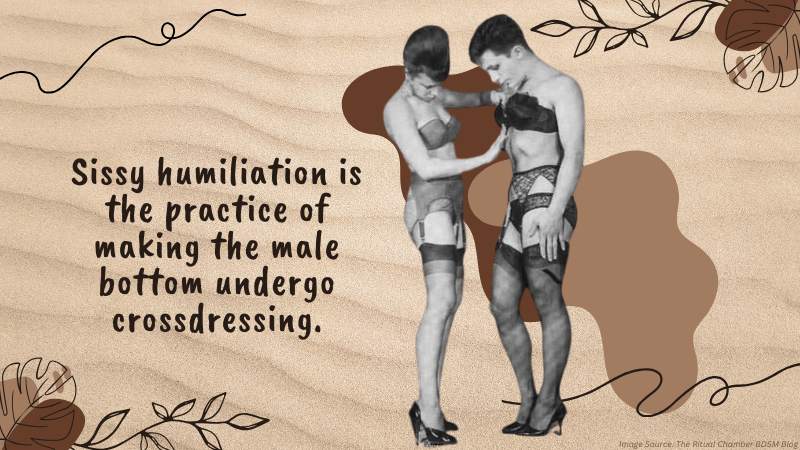 Sissy humiliation is the practice of making the male bottom undergo crossdressing. We can be feminized to elicit guilt. We have to wear a bra and a bomber jacket, for instance. Or we can be asked to wear lipstick and go outside.