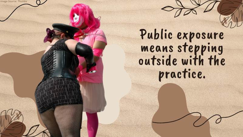 Public exposure means stepping outside with the practice. For instance, we can wear revealing feminine clothing like sexy skirts or go to a public pool in a bikini.