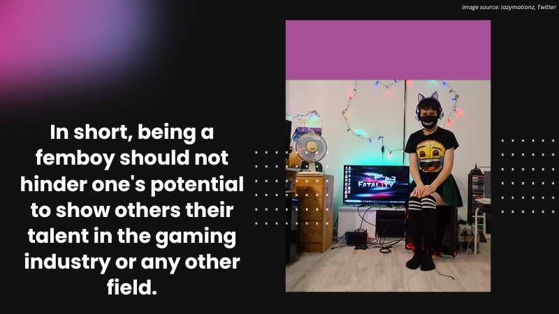 Being a femboy, or identifying as someone who presents themselves in a more feminine way while still identifying as male, should not be a barrier to success in the gaming industry or any other field. Individuals can express themselves and pursue their passions without fear of discrimination or judgment based on their gender identity. The gaming industry needs to create a welcoming and inclusive environment for all individuals, regardless of gender identity or other characteristics.