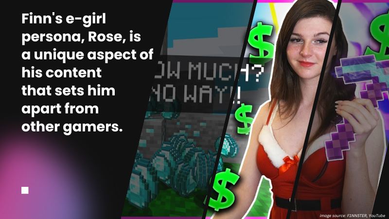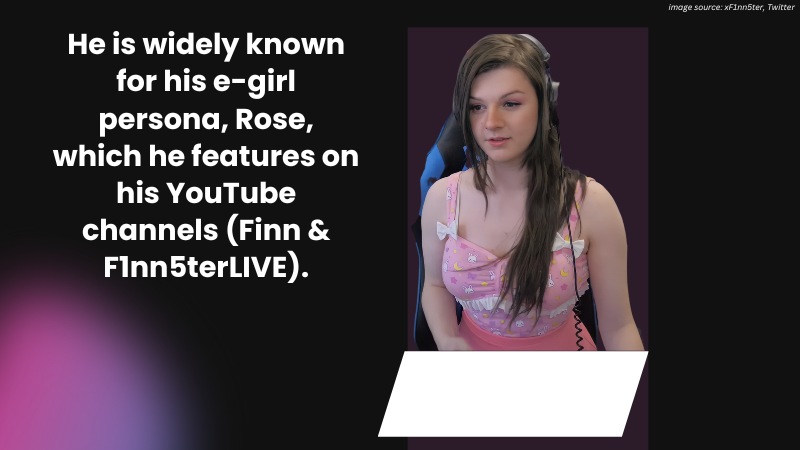 He is widely known for his e-girl persona, Rose, which he features on his YouTube channels (Finn & F1nn5terLIVE). A significant portion of his fan base comes from his e-girl content, where he dresses up as a girl. He has gained a large following through this. Finn is also known for his Minecraft gaming content. He shares his extensive knowledge of the game and provides tips and tricks to help other players improve their gameplay.