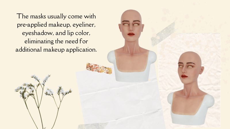 The masks usually come with pre-applied makeup, eyeliner, eyeshadow, and lip color, eliminating the need for additional makeup application.