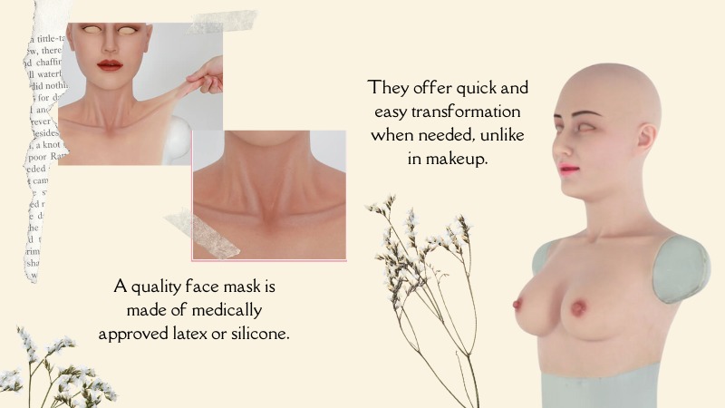 These masks conceal masculine physical features and offer a realistic feminine appearance.