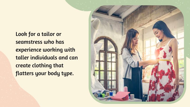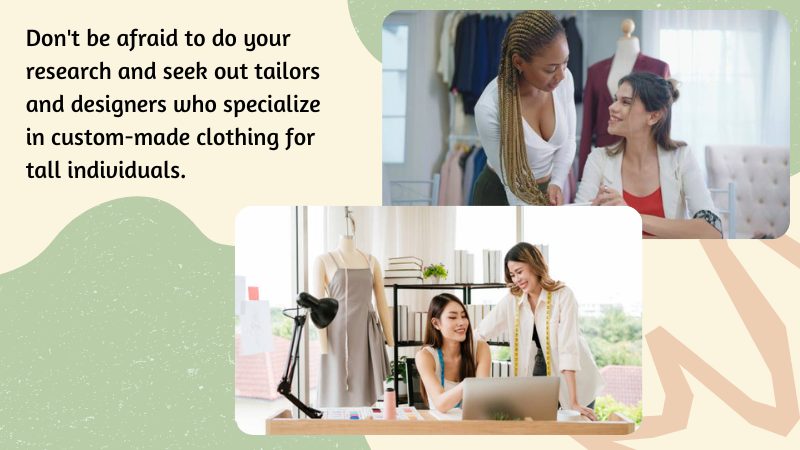If you’re having trouble finding clothing that fits well, consider having some pieces custom-made. This can be especially helpful for items such as dresses or suits, where a proper fit is essential. Look for a tailor or seamstress who has experience working with taller individuals and can create clothing that flatters your body type.