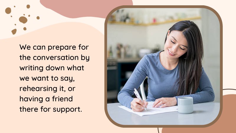 We can prepare for the conversation by writing down what we want to say, rehearsing it, or having a friend there for support.