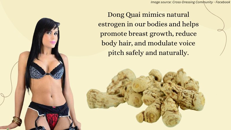 Dong Quai (or Angelica sinensis) is an aromatic herb from Asia. It’s been used for centuries to treat various ailments but also contains a high concentration of phytoestrogens – making it one of the most effective feminizing herbs! When ingested, Dong Quai mimics natural estrogen in our bodies and helps promote breast growth, reduce body hair, and modulate voice pitch safely and naturally.