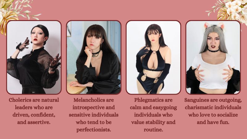 Dominant personality traits: choleric, melancholic, phlegmatic, and sanguine. Cholerics are natural leaders who are driven, confident, and assertive. Melancholics are introspective and sensitive individuals who tend to be perfectionists. Phlegmatics are calm and easygoing individuals who value stability and routine. Sanguines are outgoing, charismatic individuals who love to socialize and have fun.