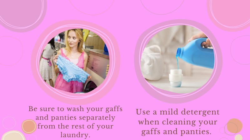 - Use a mild detergent when cleaning your gaffs and panties. Avoid using harsh chemicals or bleach, as this can damage the fabric.
