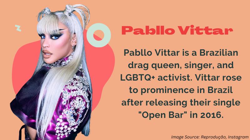 Pabllo Vittar is a Brazilian drag queen, singer, and LGBTQ+ activist. Vittar rose to prominence in Brazil after releasing their single “Open Bar” in 2016. Since then, they have become one of the most successful and well-known drag queens not only in Brazil but also in all of Latin America! With a strong and powerful stage presence, flamboyant fashion sense, and unique musical style that blends elements of different genres, they are a force to reckon with! Vittar has become a cultural icon in Brazil and is considered one of the current generation’s most influential and important drag performers. They still carry the flame of the drag sisters of the past! In addition to their music and performance career, Vittar is an outspoken advocate for LGBTQ+. With many hits on every music platform, you shouldn’t go by without listening to some of their tunes!