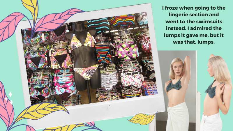 It was around this time that I began to slowly accumulate a crossdressing wardrobe. I still had my bikini top, but with the advent of self serve checkouts in department stores, I could buy a pair of panties or a bra without too much notice. I began to learn some of the tricks crossdressers used to make curves; I was interested in having my own boobs, so I filled water ballons and used them to create a more natural curve and weight. No matter how much I tried though, it never felt quite right enough.