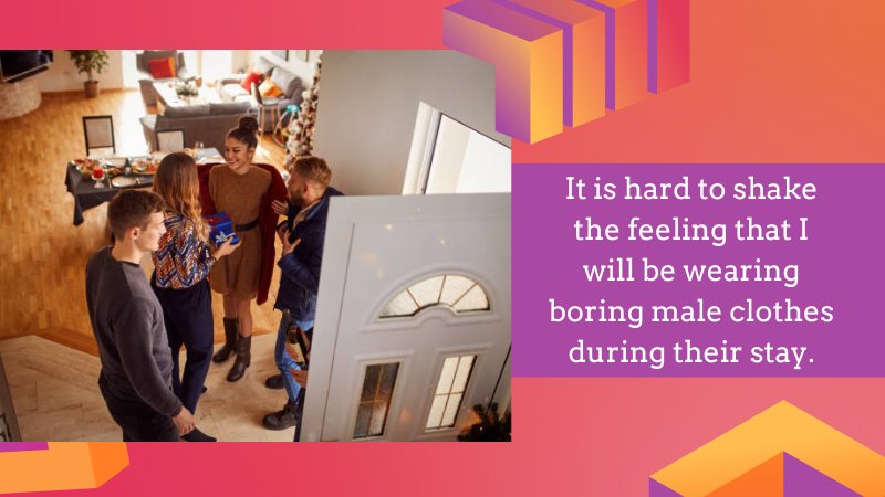 A true dilemma for every socialite crossdresser. As a person that loves having people over and enjoying some quality time with them, I must admit that it is hard to shake the feeling that I will be wearing boring male clothes during their stay. Perhaps, this is the trickiest situation of all the ones listed in this article. From the moment you open your door to your guests, the most unpredictable and unwanted can happen.
