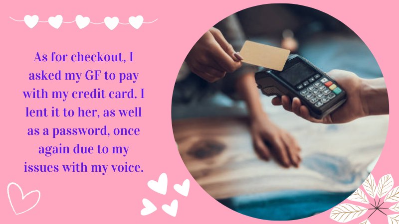 As for checkout, I asked my GF to pay with my credit card. I lent it to her, as well as a password, once again due to my issues with my voice.