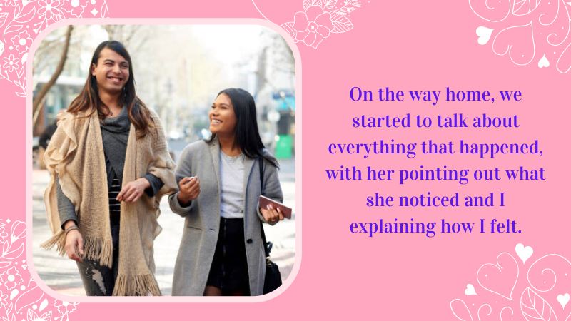 On the way home, we started to talk about everything that happened, with her pointing out what she noticed and me explaining how I felt.