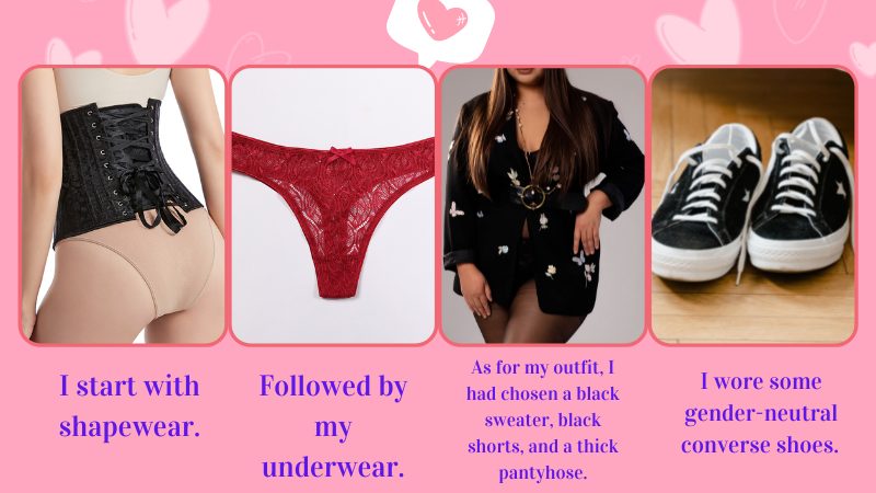 As for my outfit, I had chosen a black sweater, black shorts, and thick pantyhose (As I hadn’t shaved my legs so well, plus it was cold).