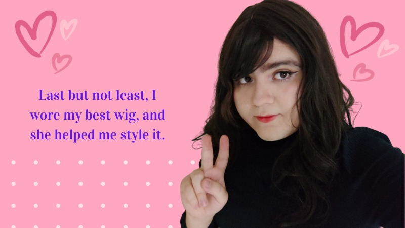 Last but not least, I wore my best wig, and she helped me style it.
