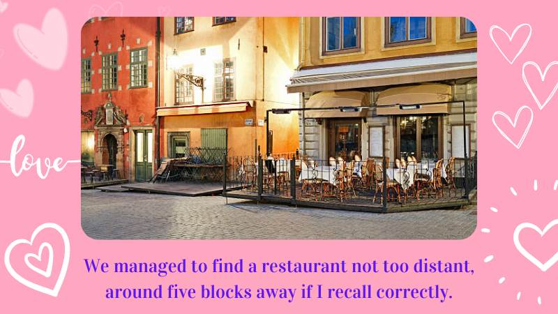 So there are few places to go late at night. But we managed to find a restaurant not too distant, around five blocks away if I recall correctly.