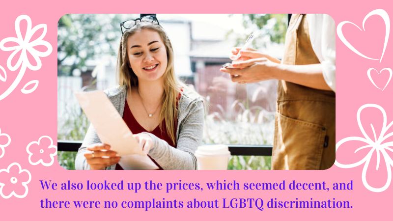 We also looked up the prices, which seemed decent, and there were no complaints about LGBTQ discrimination.
