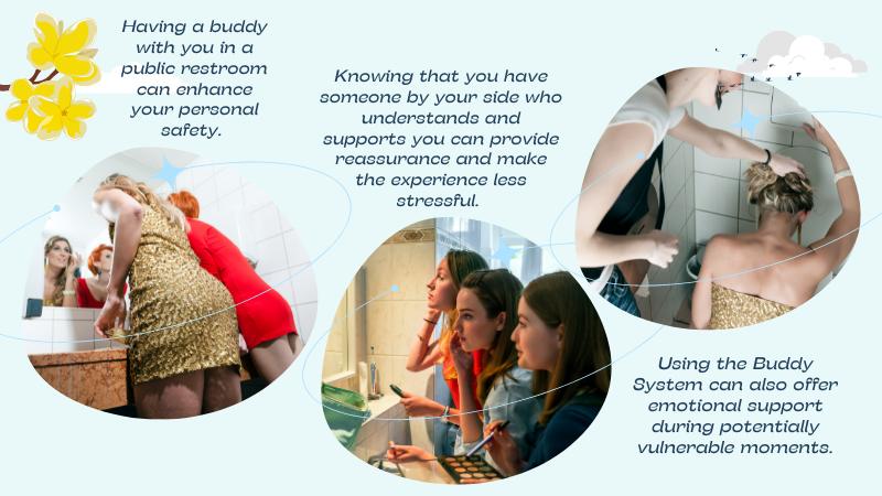 Having a buddy with you in a public restroom can enhance your personal safety. A trusted friend or ally can provide a sense of security and support, especially in unfamiliar or potentially risky situations. They can help you watch out for any potential dangers or intervene if needed.