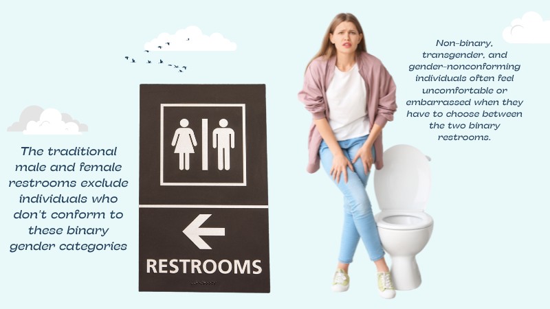 - Binary division of restrooms– The traditional male and female restrooms exclude individuals who don’t conform to these binary gender categories.