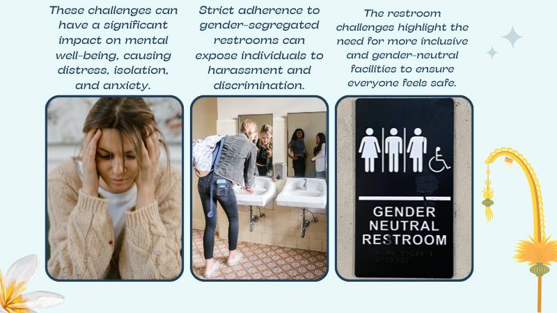 - Harassment and discrimination– Strict adherence to gender-segregated restrooms can expose individuals to harassment and discrimination, particularly those who do not conform to traditional gender norms.