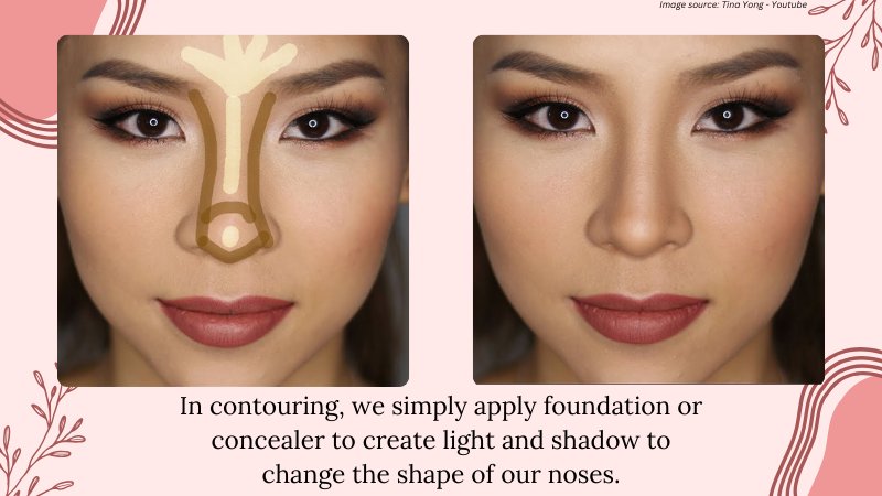 In contouring, we simply apply foundation or concealer to create light and shadow to change the shape of our noses.