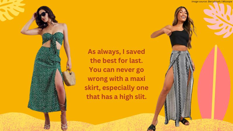 You can either go for a maxi flowy skirt and pair it with some nice sandals,