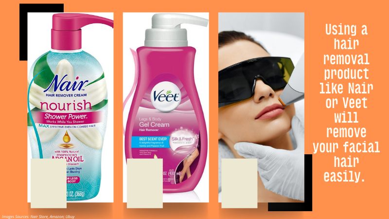 Using a hair removal product like Nair or Veet will remove your facial hair easily, burning its roots.