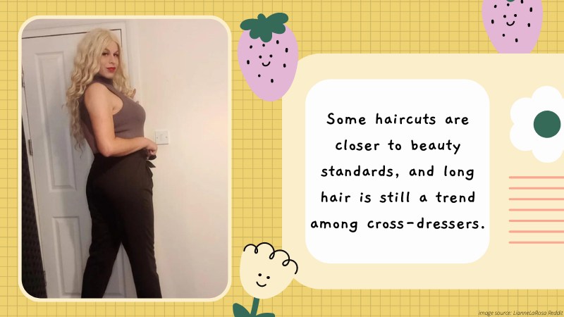 But still, some haircuts are closer to beauty standards, and long hair is still a trend among cross-dressers.