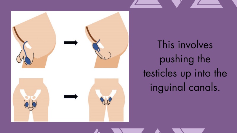 This involves pushing the testicles up into the inguinal canals. Okay, that’s a medical term that most don’t know.