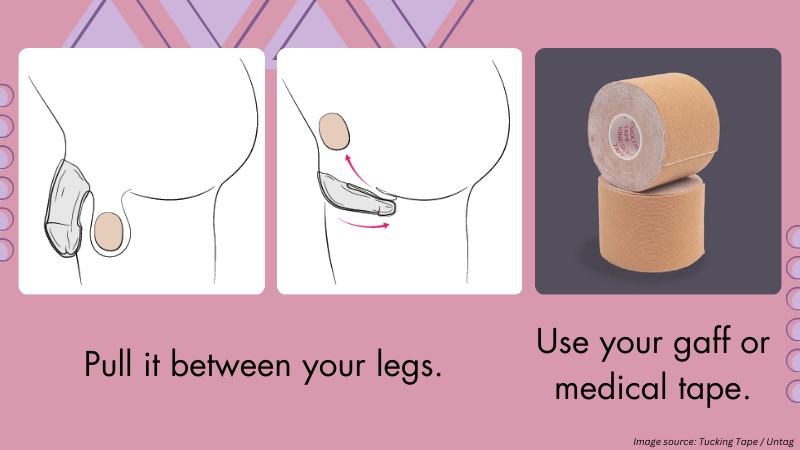 For a secure tuck, you can start taping from your lower abdomen, over to your penis, and your bum.